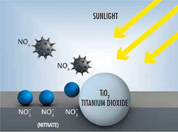 Det aktive betongranulat er specielt modificeret med titanium dioxid (TiO2), der fungerer som katalysator sammen med sollys. I denne katalytiske proces bliver passerende NOx partikler omdannet til harmløst Nitrat (NO3-), som skylles væk når det regner.