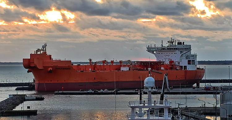 Skibet hedder Eagle Barents og er en såkaldt shuttle tanker indregistreret på Bahamas. Da skibet ankom i går eftermiddags blev det mødt af lods Kim Pedersen og to bugserbåd. Sammen fik de skibet sikkert til havnens krydstogtskaj.