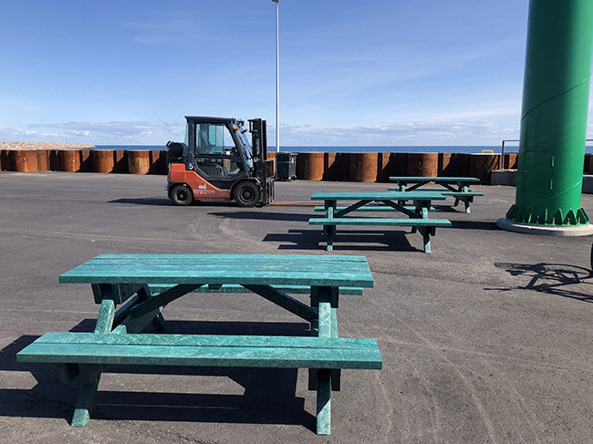 Det nye molehoved er hele 900 m2 stort, og her har Skagen Havn netop opsat 3 bordebænkesæt. Og det er ikke blot hvilke som helst bordebænkesæt. Den karakteristiske grønne farve, leder tankerne hen på fisketrawl, og faktisk er det netop fisketrawl, de er lavet af.